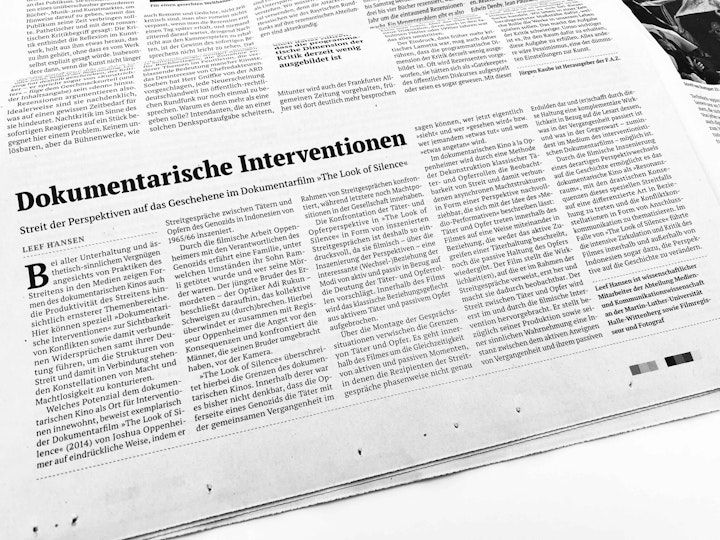 In the article "Documentary Interventions. Conflict of perspectives on the past within the documentary »The Look of Silence«", Leef Hansen reflects on the potential of documentary cinema as a place for interventions.